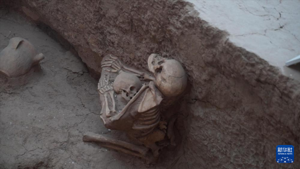 记者在F3号房址旁看到,房内有两具人骨。一位女性双膝跪地,臀部坐落在脚跟上,双手搂抱着一位幼儿,幼儿依偎怀中,双手也紧楼着大人的腰部。