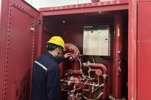 图为五值人员检查主变洞发电机喷雾灭火机械控制柜