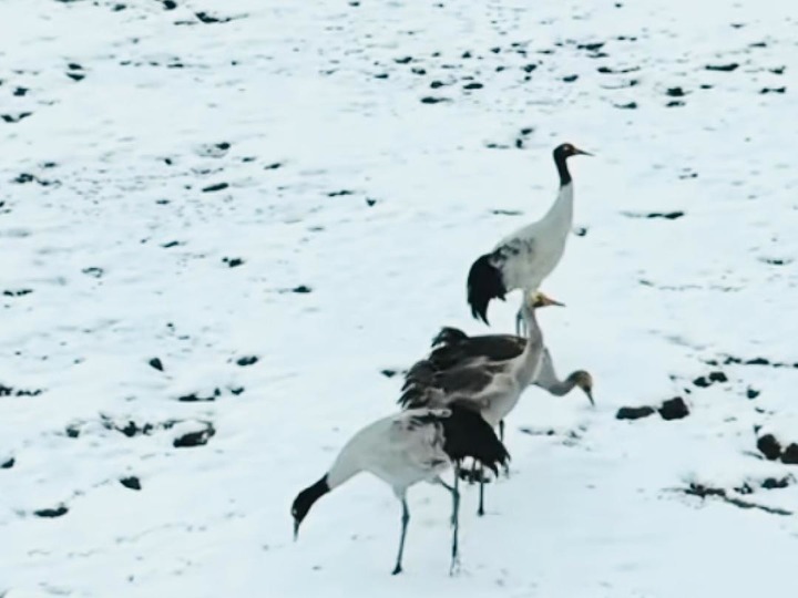 青海省玉树藏族自治州玉树市境内的隆宝滩湿地位于长江源头地区,这里水草丰美,是候鸟迁徙路线上的关键驿站与繁殖地。隆宝滩湿地平均海拔超过4200米,是我国建立的第一个以黑颈鹤及其繁殖地为主要保护对象的自然保护区。冬季到来后,黑颈鹤在湿地中翩然漫步。