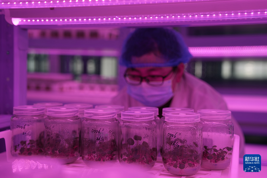 11月21日,工作人员在青海省西宁市湟中区一家农业科技企业的草莓脱毒育苗中心查看原原种的生根情况。新华社记者 张子琪 摄