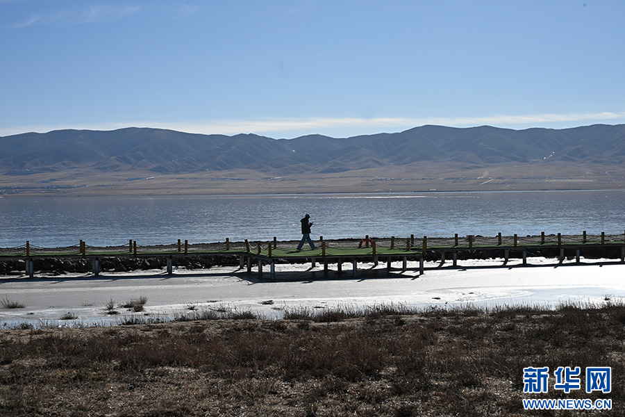 进入12月后,青海湖湖面逐渐冰封,冰面上自然形成了冰裂纹和冰泡,在阳光照射下闪烁着光芒。冰与水交融的独特景致吸引游客纷至沓来,定格这份高原冬日的限定美景。