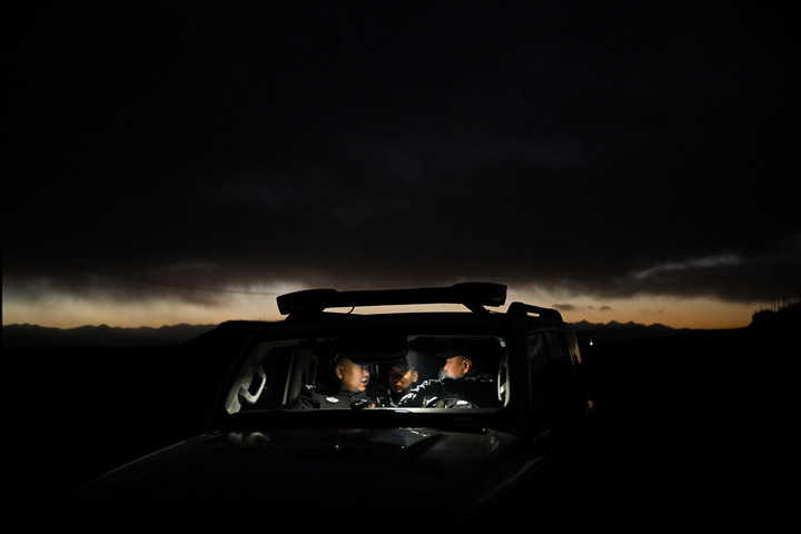 1月8日夜晚,门源县公安局浩门森林公安派出所老虎沟生态警务室的民警在巡护途中休息。